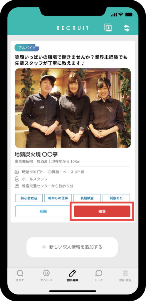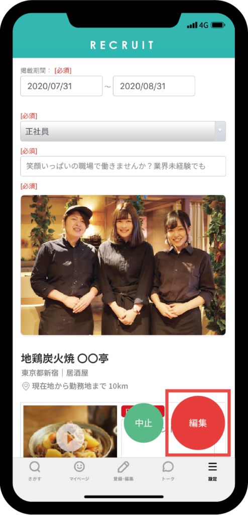 求人情報の編集はアプリ内で簡単にリアルタイムで変更することが可能です。タイムロスなく情報を編集できることで機会損失を防ぎます。