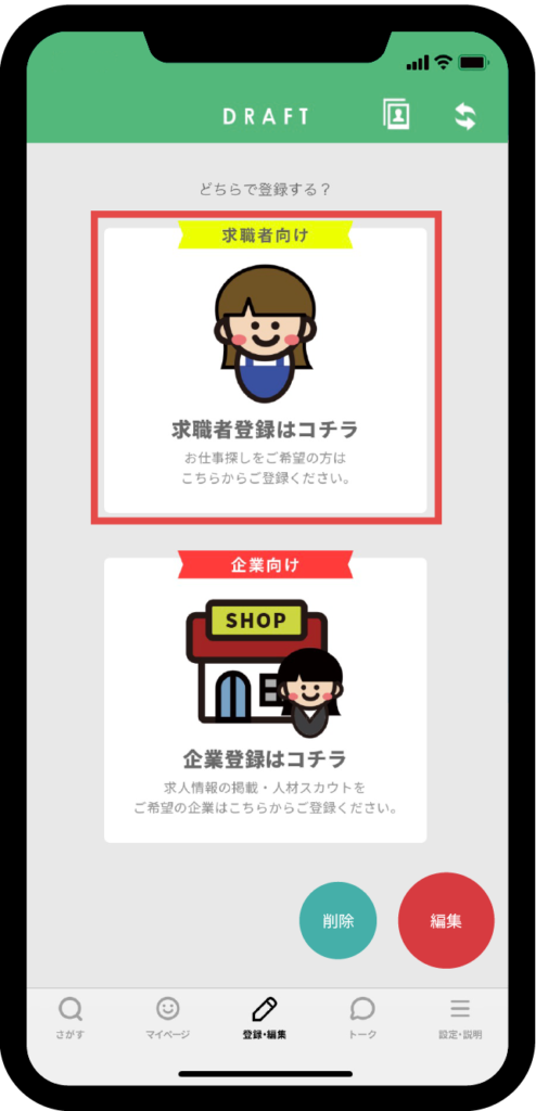お仕事への応募・匿名の簡易履歴書への登録にはユーザー登録が必要です。新規会員登録より求職者ユーザーで新規登録を行います。