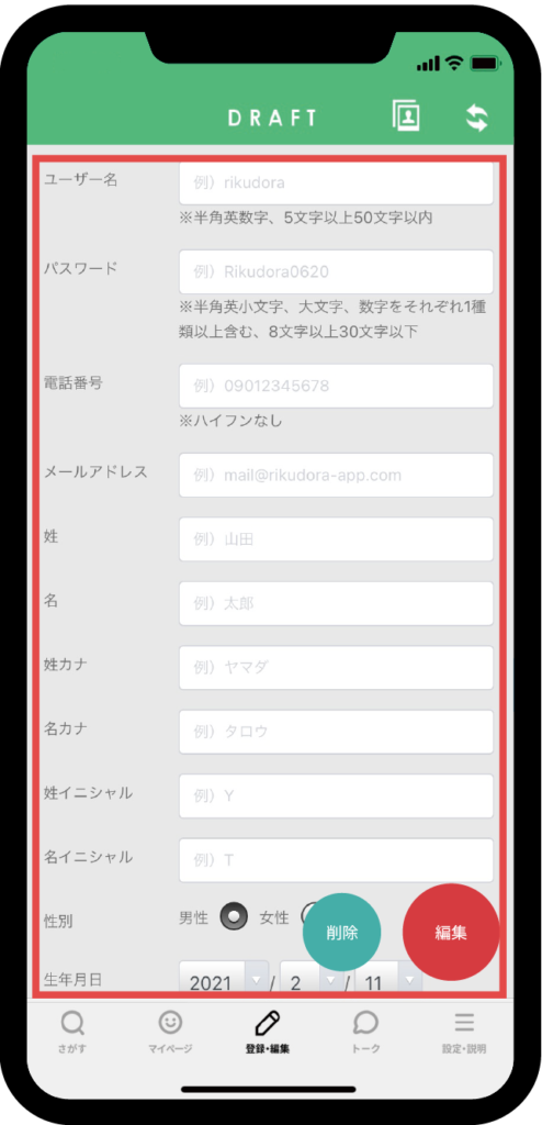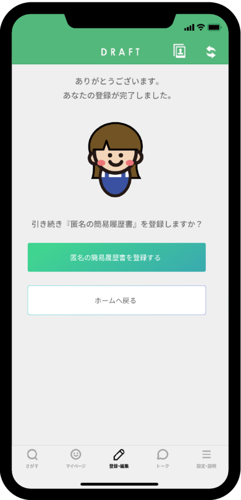 入力内容を確認後に求職者登録が完了します。引き続き履歴書を作成したい場合は、『匿名の簡易履歴書を登録』を選択してください。