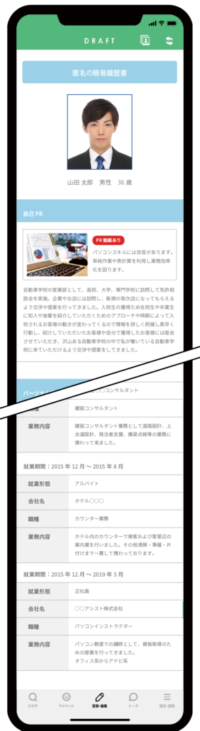 入力内容に誤りがないように確認を行います。そのまま登録へ進むことで求履歴書情報を登録できます。